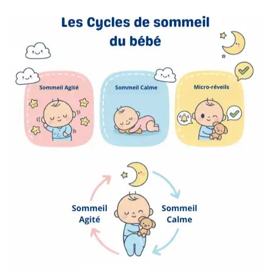 À la fin de chaque cycle, le bébé passe par une phase de micro-réveil. C’est normal, biologique, et même protecteur. Il vérifie inconsciemment si son environnement est sûr. Certains bébés se rendorment aussitôt. D’autres appellent, pleurent ou cherchent une présence familière.